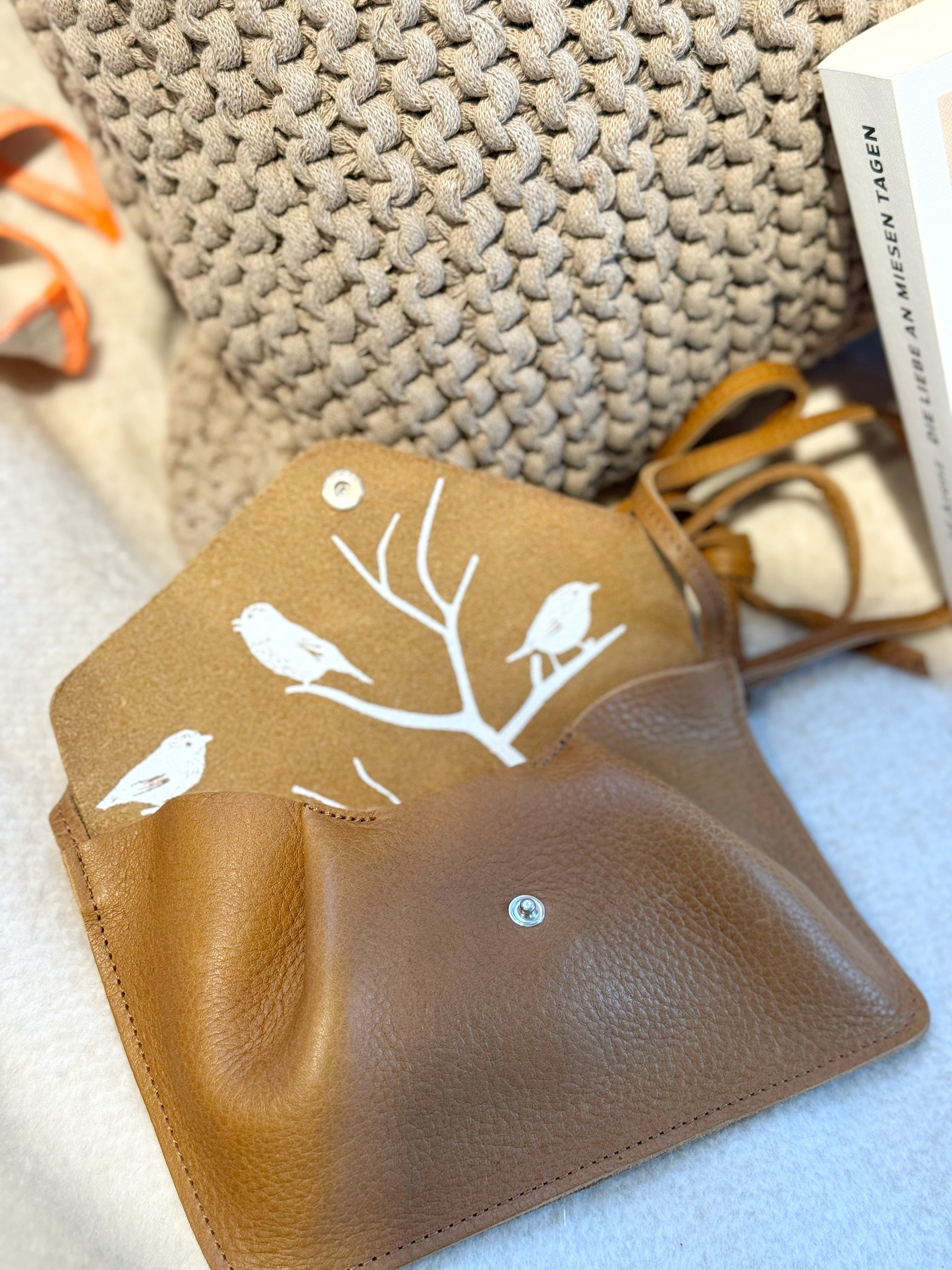 Klein und leicht und dank der Falten geräumig genug für Handy und ein, zwei Kleinigkeiten, Auf der Rückseite gibt es außerdem ein separates Fach für die Kreditkarte oder einen Geldschein. Der Siebdruck auf der Innenseite mit drei Nachtigallen, die dich begleiten.