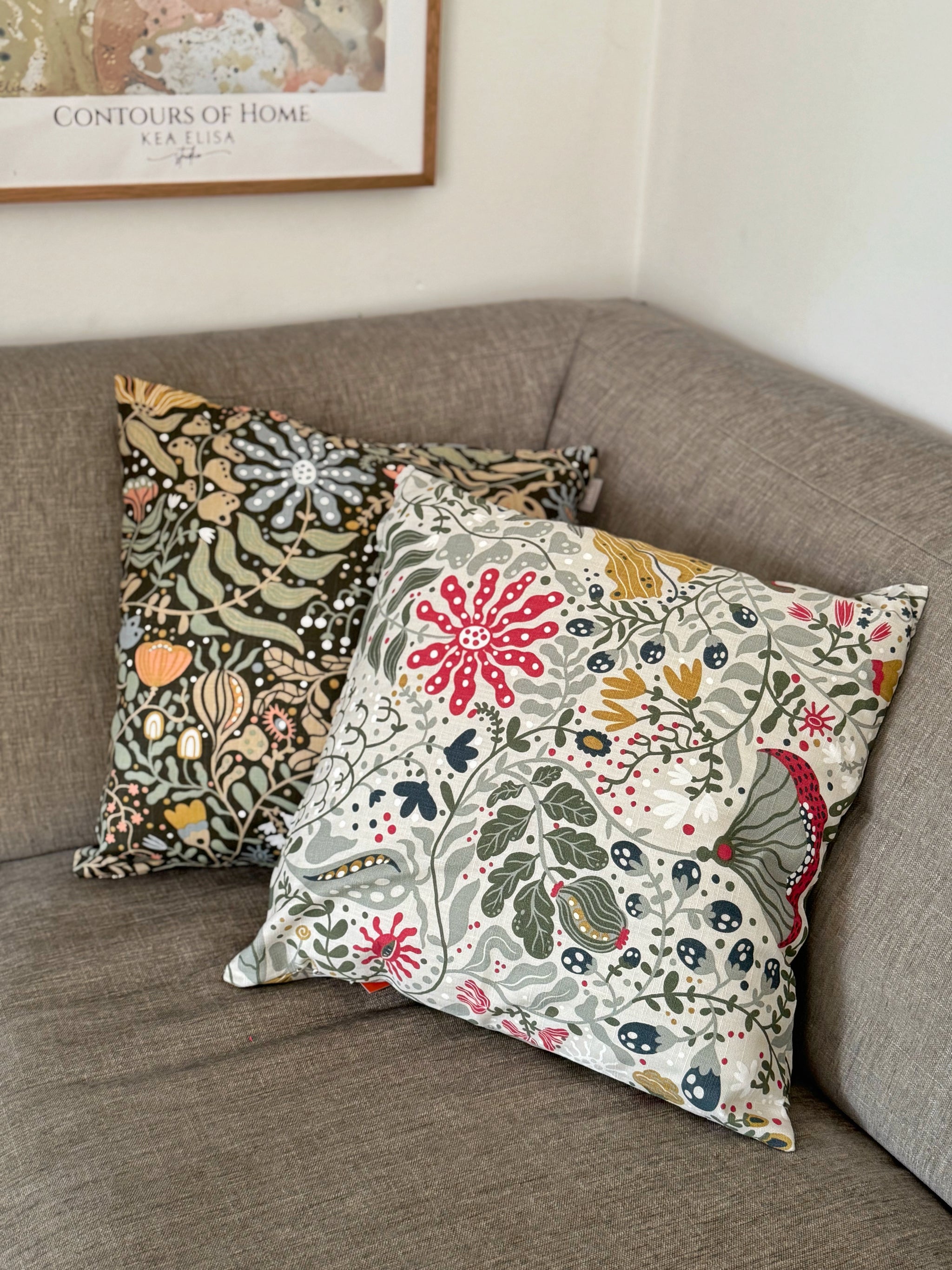 – leider ausverkauftDen Garten auf der Couch? Ganz einfach mit den schönen Kissenbezügen aus Schweden. Herrlich kombinierbar und einfach gemütlich. Beidseitig bedruckt ist jedes Kissen ein Unikat, je nachdem wie das Muster zugeschnitten ist.